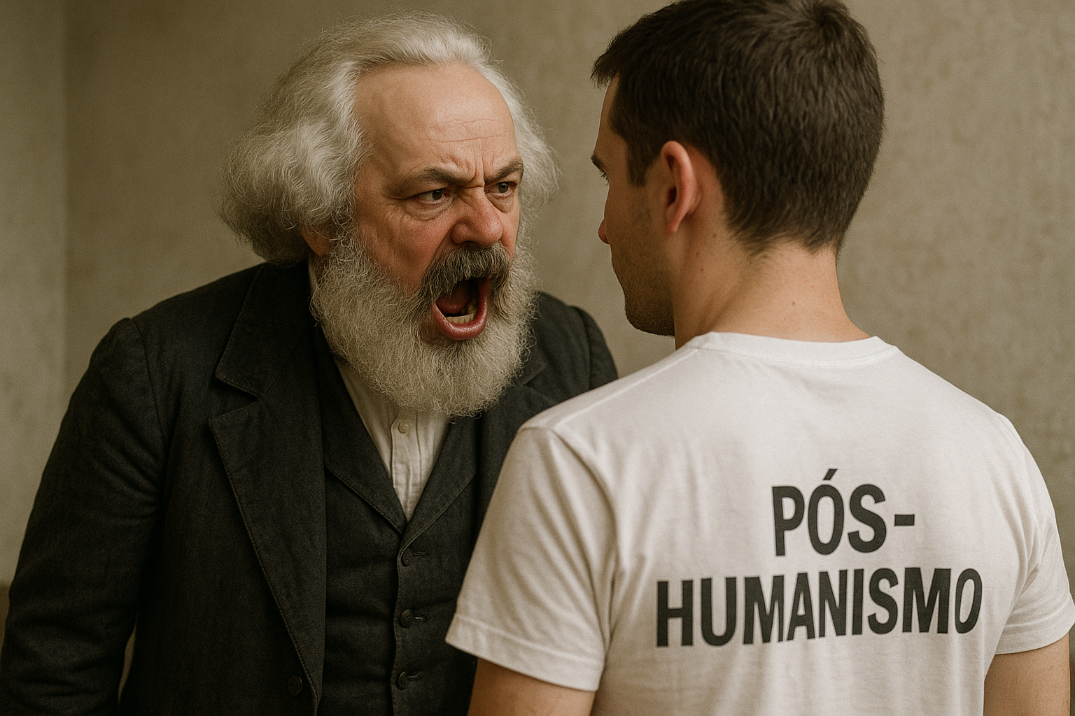 Nesse cenário, o humanismo não é um simples detalhe na superfície do continente Marx, como se fosse uma mera decoração. Ao contrário, ele é uma matriz inevitável, o alicerce de todo o edifício marxiano (e marxista), desde argumentos mais abstratos, até inclinações práticas revolucionárias. Sem ele como cimento, como estrutura, não existe crítica ao capitalismo, nem mesmo uma revolução no horizonte. O conceito de práxis, nesse caso, apresenta o humano como um elo inevitável entre teoria e prática, o terceiro elemento de uma trialética. Em outras palavras, a dialética nunca existiu, já que sempre foi uma tríade, costurada pelo maior critério correlacionista criado pelo humano: o humano. Essa instância humanoide conecta a teoria e a prática como polos epistêmicos e ontológicos, tudo isso dentro de um sistema não apenas humanista, mas inevitavelmente humanista… orgulhosamente humanista.